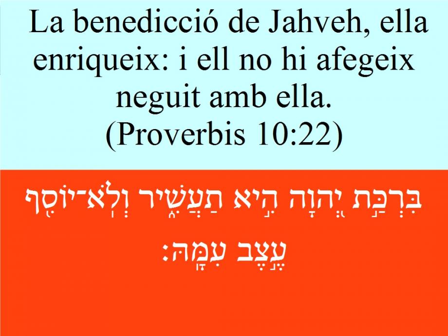 Proverbis 10v22 La benedicció de Jahveh, ella enriqueix: i Ell no hi afegeix neguit amb ella. בִּרְכַּ֣ת יְ֭הוָה הִ֣יא תַעֲשִׁ֑יר וְלֹֽא־יוֹסִ֖ף עֶ֣צֶב עִמָּֽהּ׃