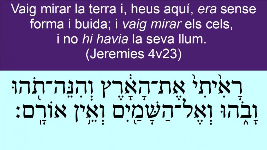 Jeremies 4v23 Vaig mirar la terra i, heus aquí, era sense forma i buida; i vaig mirar els cels, i no hi havia la seva llum.רָאִ֙יתִי֙ אֶת־הָאָ֔רֶץ וְהִנֵּה־תֹ֖הוּ וָבֹ֑הוּ וְאֶל־הַשָּׁמַ֖יִם וְאֵ֥ין אוֹרָֽם׃ I beheld <07200> (08804) the earth <0776>, and, lo, it was without form <08414>, and void <0922>; and the heavens <08064>, and they had no light <0216>.