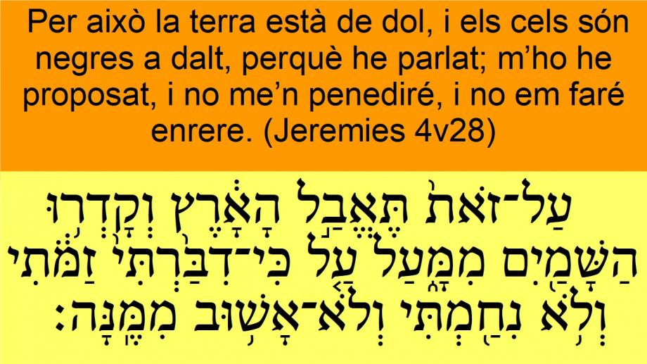 Jeremies 4v28 Per això la terra està de dol, i els cels són negres a dalt, perquè he parlat; m’ho he proposat, i no me’n penediré, i no em faré enrere.עַל־זֹאת֙ תֶּאֱבַ֣ל הָאָ֔רֶץ וְקָדְר֥וּ הַשָּׁמַ֖יִם מִמָּ֑עַל עַ֤ל כִּי־דִבַּ֙רְתִּי֙ זַמֹּ֔תִי וְלֹ֥א נִחַ֖מְתִּי וְלֹא־אָשׁ֥וּב מִמֶּֽנָּה׃ For this shall the earth <0776> mourn <056> (08799), and the heavens <08064> above <04605> be black <06937> (08804): because I have spoken <01696> (08765) it, I have purposed <02161> (08804) it, and will not repent <05162> (08738), neither will I turn back <07725> (08799) from it.