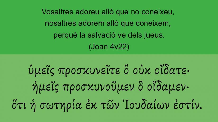 Joan 4v22 Vosaltres adoreu allò que no coneixeu, nosaltres adorem allò que coneixem, perquè la salvació ve dels jueus.ὑμεῖς προσκυνεῖτε ὃ οὐκ οἴδατε· ἡμεῖς προσκυνοῦμεν ὃ οἴδαμεν· ὅτι ἡ σωτηρία ἐκ τῶν Ἰουδαίων ἐστίν.Gijlieden <5210> aanbidt <4352> (5719), wat <3739> gij niet <3756> weet <1492> (5758); wij <2249> aanbidden <4352> (5719), wat <3739> wij weten <1492> (5758); want <3754> de zaligheid <4991> is <2076> (5748) uit <1537> de Joden <2453>.Ye worship that which ye knowe not: we worship that which we knowe: for saluation is of the Iewes.Ye <5210> worship <4352> (5719) ye know <1492> (5758) not <3756> what <3739>: we know <1492> (5758) what <3739> we <2249> worship <4352> (5719): for <3754> salvation <4991> is <2076> (5748) of <1537> the Jews <2453>.BCI Joan 4v22 Vosaltres adoreu allò que no coneixeu;1 nosaltres adorem allò que coneixem, perquè la salvació ve dels jueus.2CCC Joan 4v22 Vosaltres adoreu allò que no coneixeu, nosaltres adorem allò que coneixem, perquè la salvació ve dels jueus.