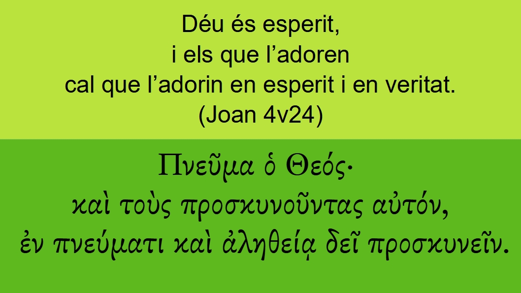 Joan 4v24 Déu és esperit, i els que l’adoren cal que l’adorin en esperit i en veritat.Πνεῦμα ὁ Θεός· καὶ τοὺς προσκυνοῦντας αὐτόν, ἐν πνεύματι καὶ ἀληθείᾳ δεῖ προσκυνεῖν.God <2316> is een Geest <4151>, en <2532> die Hem <846> aanbidden <4352> (5723), moeten <1163> (5748) Hem aanbidden <4352> (5721) in <1722> geest <4151> en <2532> waarheid <225>.God is a Spirite, and they that worship him, must worship him in spirit and trueth. God <2316> is a 1 Spirit <4151>: and <2532> they that worship <4352> (5723) him <846> must <1163> (5748) worship <4352> (5721) him in <1722> spirit <4151> and <2532> in truth <225>.BCI Joan 4v24 Déu és esperit. Per això els qui l'adoren han d'adorar-lo en Esperit i en veritat.»1CCC Joan 4v24 Déu és esperit, i els que l’adoren cal que l’adorin en esperit i en veritat.