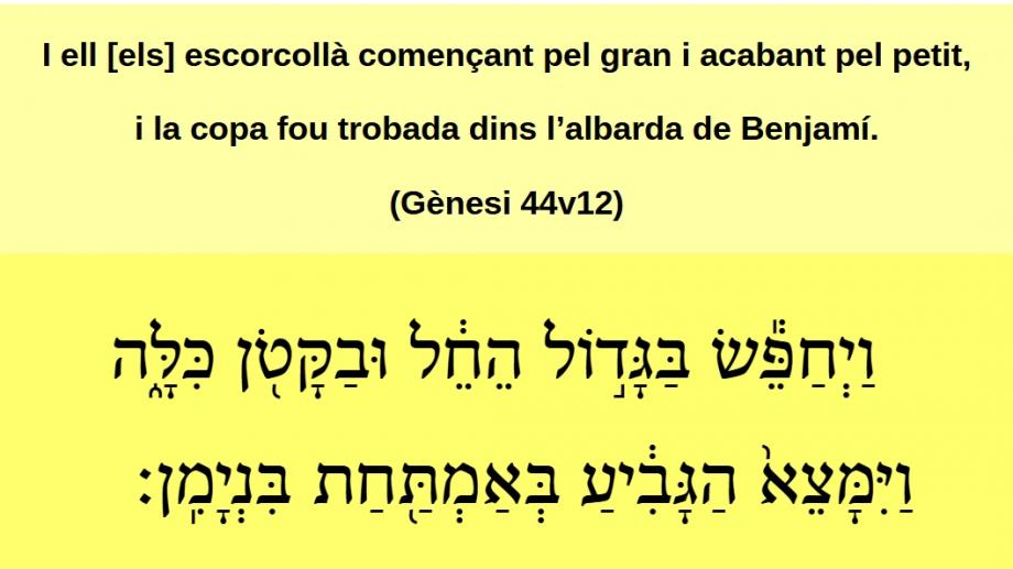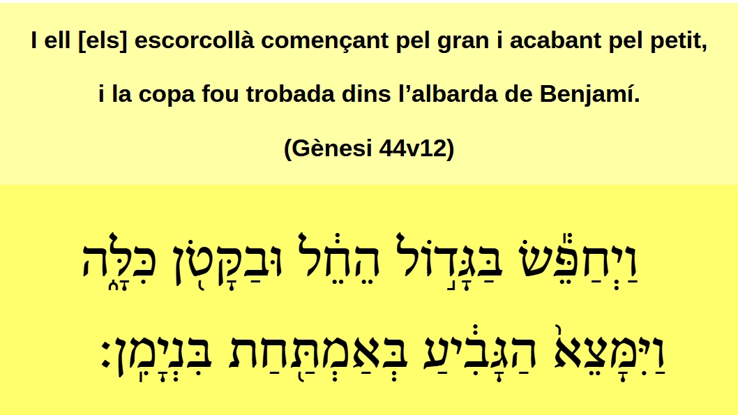 Gènesi 44v13 I s'esquinçaren els vestits, i carregaren cadascú el seu ase i tornaren a la ciutat. וַֽיִּקְרְע֖וּ שִׂמְלֹתָֿ֑ם ֽוַיַּֽעֲמֹס֙ אִ֣ישׁ עַל־חֲמֹר֔וֹ וַיָּשֻׁ֖בֿוּ הָעִֽירָהֿ׃ (Gn 44v13)
