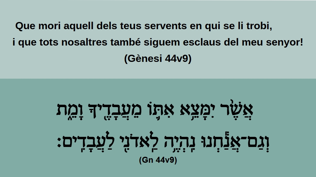 Gènesi 44v10 I ell digué: Que sigui segons les vostres paraules. Aquell en qui se li trobi, serà el meu esclau, i vosaltres esdevindreu lliures.וַיֹּ֕אֿמֶר גַּם־עַתָּ֥הֿ כְֿדִֿבְֿרֵיכֶֿ֖ם כֶּן־ה֑וּא אֲשֶׁ֨ר יִמָּצֵ֤א אִתּוֹ֙ יִֽהְיֶהֿ־לִּ֣י עָ֔בֶֿדֿ וְאַתֶּ֖ם תִּֽהְי֥וּ נְקִיִּֽם׃ (Gn 44v10)