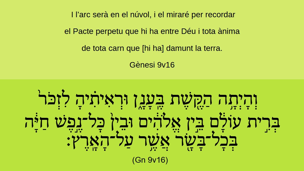 Gènesi 9v16 I l’arc serà en el núvol, i el miraré per recordar el Pacte perpetu que hi ha entre Déu i tota ànima de tota carn que [hi ha] damunt la terra.וְהָֽיְתָֿ֥הֿ הַקֶּ֖שֶׁתֿ בֶּֽעָנָ֑ן וּרְאִיתִ֗יהָ לִזְכֹּר֙ בְּרִ֣יתֿ עוֹלָ֔ם בֵּ֣ין אֱלֹהִ֔ים וּבֵֿין֙ כָּל־נֶ֣פֶֿשׁ חַיָּ֔הֿ בְּכָֿל־בָּשָׂ֖ר אֲשֶׁ֥ר עַל־הָאָֽרֶץ׃ (Gn 9v16)