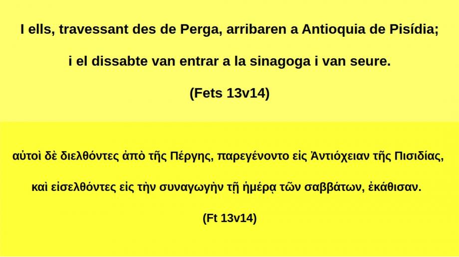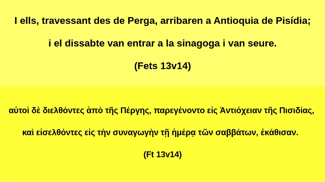 Fets 13v14 I ells, travessant des de Perga, arribaren a Antioquia de Pisídia; i el dissabte van entrar a la sinagoga i van seure.αὐτοὶ δὲ διελθόντες ἀπὸ τῆς Πέργης, παρεγένοντο εἰς Ἀντιόχειαν τῆς Πισιδίας, καὶ εἰσελθόντες εἰς τὴν συναγωγὴν τῇ ἡμέρᾳ τῶν σαββάτων, ἐκάθισαν. (Ft 13v14)