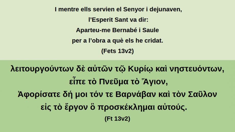 Fets 13v2 I mentre ells servien el Senyor i dejunaven, l’Esperit Sant va dir: Aparteu-me Bernabé i Saule per a l’obra a què els he cridat.λειτουργούντων δὲ αὐτῶν τῷ Κυρίῳ καὶ νηστευόντων, εἶπε τὸ Πνεῦμα τὸ Ἅγιον, Ἀφορίσατε δή μοι τόν τε Βαρνάβαν καὶ τὸν Σαῦλον εἰς τὸ ἔργον ὃ προσκέκλημαι αὐτούς. (Ft 13v2)