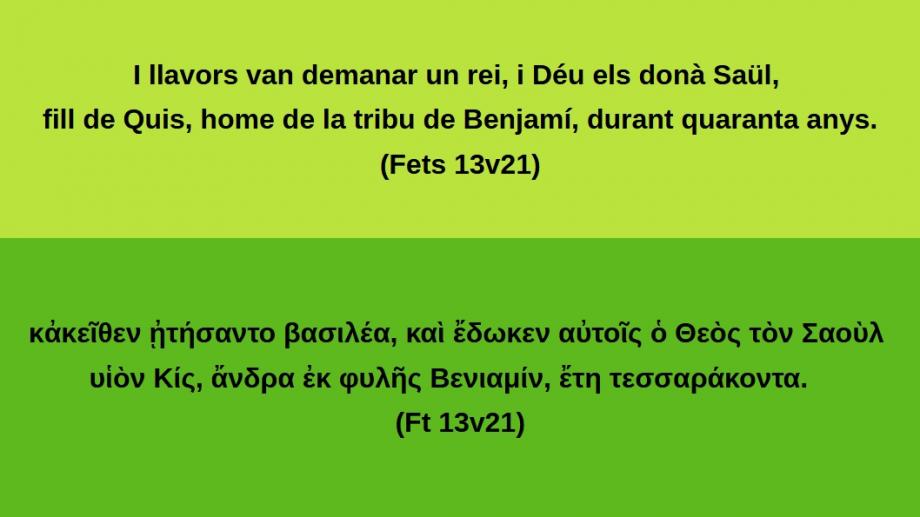 Fets 13v21 I llavors van demanar un rei, i Déu els donà Saül, fill de Quis, home de la tribu de Benjamí, durant quaranta anys. κἀκεῖθεν ᾐτήσαντο βασιλέα, καὶ ἔδωκεν αὐτοῖς ὁ Θεὸς τὸν Σαοὺλ υἱὸν Κίς, ἄνδρα ἐκ φυλῆς Βενιαμίν, ἔτη τεσσαράκοντα. (Ft 13v21)