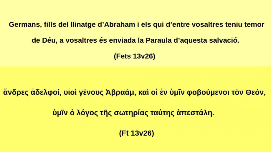Fets 13v26 Germans, fills del llinatge d’Abraham i els qui d’entre vosaltres teniu temor de Déu, a vosaltres és enviada la Paraula d’aquesta salvació.ἄνδρες ἀδελφοί, υἱοὶ γένους Ἀβραάμ, καὶ οἱ ἐν ὑμῖν φοβούμενοι τὸν Θεόν, ὑμῖν ὁ λόγος τῆς σωτηρίας ταύτης ἀπεστάλη. (Ft 13v26)