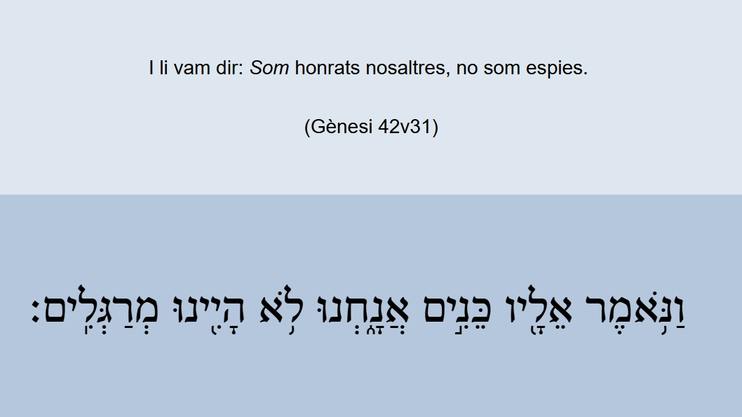 Gènesi 42v31 I li vam dir: [Som] honrats nosaltres, no som espies. וַנֹּ֥אֿמֶר אֵלָ֖יו כֵּנִ֣ים אֲנָ֑חְנוּ לֹ֥א הָיִ֖ינוּ מְרַגְּלִֽים׃ (Gn 42v31)