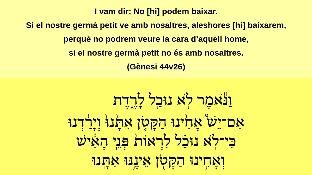 Gènesi 44v24 I s’esdevingué que, quan vam pujar al teu servent, el meu pare, li vam fer saber les paraules del meu senyor. וַֽיְהִי֙ כִּ֣י עָלִ֔ינוּ אֶֽל־עַבְֿדְּךָֿ֖ אָבִֿ֑י וַנַּ֨גֶּדֿ־ל֔וֹ אֵ֖תֿ דִּבְֿרֵ֥י אֲדֹֿנִֽי׃ (Gn 44v24)