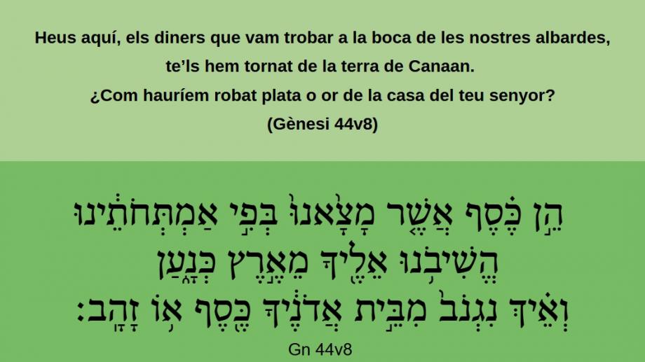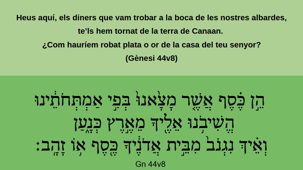 Gènesi 44v8 Heus aquí, els diners que vam trobar a la boca de les nostres albardes, te’ls hem tornat de la terra de Canaan. ¿Com hauríem robat plata o or de la casa del teu senyor?הֵ֣ן כֶּ֗סֶףֿ אֲשֶׁ֤ר מָצָ֙אֿנוּ֙ בְּפִֿ֣י אַמְתְּחֹתֵ֔ינוּ הֱשִׁיבֹֿ֥נוּ אֵלֶ֖יךָֿ מֵאֶ֣רֶץ כְּנָ֑עַן וְאֵ֗יךְֿ נִגְֿנֹב֙ מִבֵּ֣יתֿ אֲדֹֿנֶ֔יךָֿ כֶּ֖סֶףֿ א֥וֹ זָהָֽבֿ׃ (Gn 44v8)