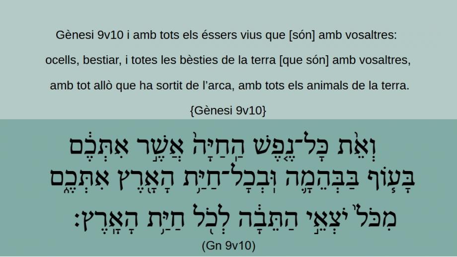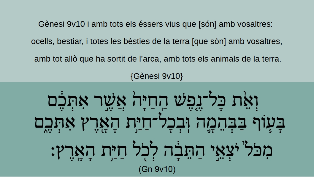 Gènesi 9v9 I Jo, heus aquí, Jo estableixo el Meu Pacte amb vosaltres i amb el vostre llinatge després de vosaltres, וַֽאֲנִ֕י הִנְנִ֥י מֵקִ֛ים אֶֽתֿ־בְּרִיתִֿ֖י אִתְּכֶֿ֑ם וְאֶֽתֿ־זַרְעֲכֶֿ֖ם אַֽחֲרֵיכֶֽֿם׃ (Gn 9v9)