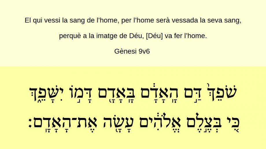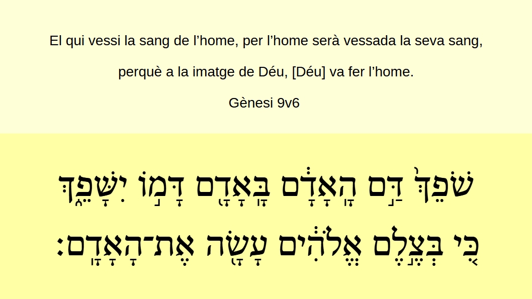 Gènesi 9v6 El qui vessi la sang de l’home, per l’home serà vessada la seva sang, perquè a la imatge de Déu, [Déu] va fer l’home. שֹׁפֵֿךְ֙ דַּ֣ם הָֽאָדָ֔ם בָּֽאָדָֿ֖ם דָּמ֣וֹ יִשָּׁפֵֿ֑ךְֿ כִּ֚י בְּצֶ֣לֶם אֱלֹהִ֔ים עָשָׂ֖הֿ אֶתֿ־הָֽאָדָֽֿם׃ (Gn 9v6)