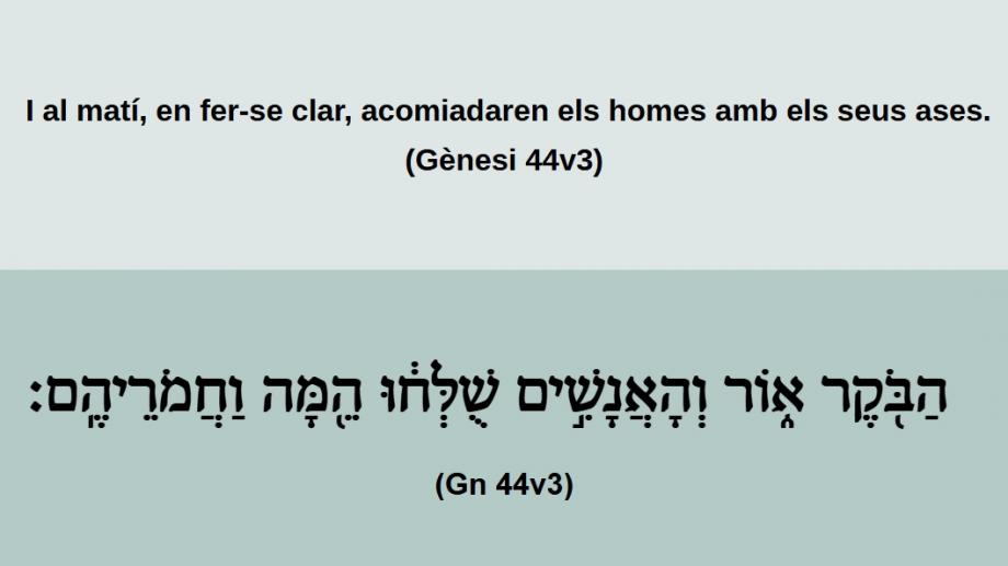 Gènesi 44v3 I al matí, en fer-se clar, acomiadaren els homes amb els seus ases. הַבֹּ֖קֶר א֑וֹר וְהָֽאֲנָשִׁ֣ים שֻׁלְּח֔וּ הֵ֖מָּהֿ וַֽחֲמֹֽרֵיהֶֽם׃ (Gn 44v3)