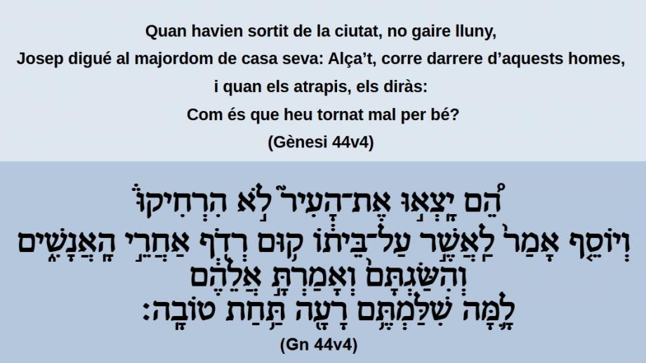 Gènesi 44v4 Quan havien sortit de la ciutat, no gaire lluny, Josep digué al majordom de casa seva: Alça’t, corre darrere d’aquests homes, i quan els atrapis, els diràs: Com és que heu tornat mal per bé?הֵ֠ם יָֽצְא֣וּ אֶתֿ־הָעִיר֘ לֹ֣א הִרְחִיקוּ֒ וְיוֹסֵ֤ףֿ אָמַר֙ לַֽאֲשֶׁ֣ר עַל־בֵּית֔וֹ ק֥וּם רְדֹֿ֖ףֿ אַֽחֲרֵ֣י הָֽאֲנָשִׁ֑ים וְהִשַּׂגְֿתָּם֙ וְאָֽמַרְתָּ֣ אֲלֵהֶ֔ם לָ֛מָּהֿ שִׁלַּמְתֶּ֥ם רָעָ֖הֿ תַּ֥חַתֿ טוֹבָֽֿהֿ׃ (Gn 44v4)