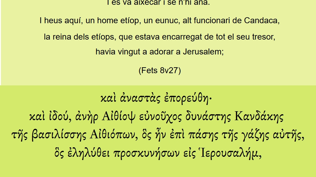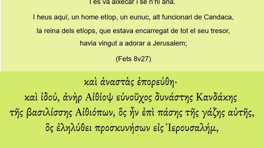 Fets 8v27 I es va aixecar i se n’hi anà. I heus aquí, un home etíop, un eunuc, alt funcionari de Candaca, la reina dels etíops, que estava encarregat de tot el seu tresor, havia vingut a adorar a Jerusalem;καὶ ἀναστὰς ἐπορεύθη· καὶ ἰδού, ἀνὴρ Αἰθίοψ εὐνοῦχος δυνάστης Κανδάκης τῆς βασιλίσσης Αἰθιόπων, ὃς ἦν ἐπὶ πάσης τῆς γάζης αὐτῆς, ὃς ἐληλύθει προσκυνήσων εἰς Ἱερουσαλήμ,