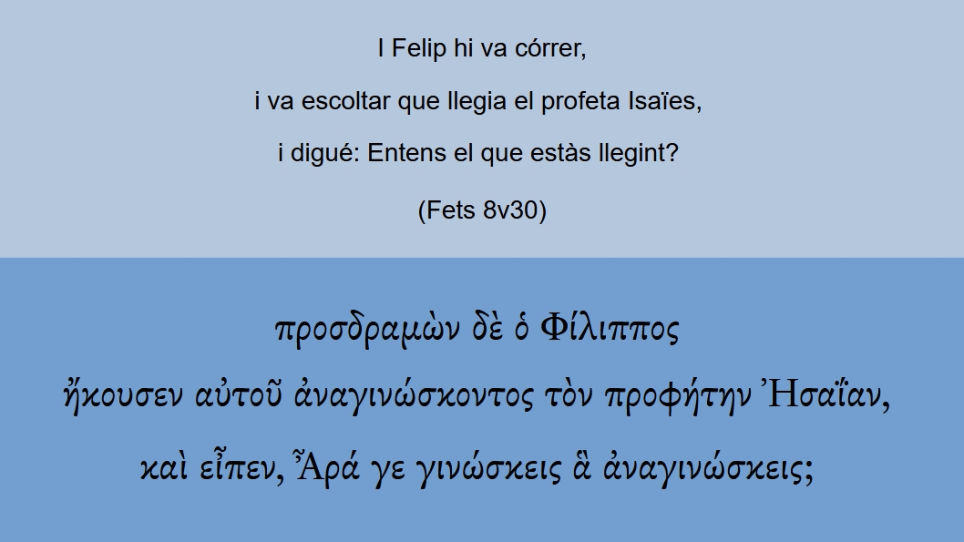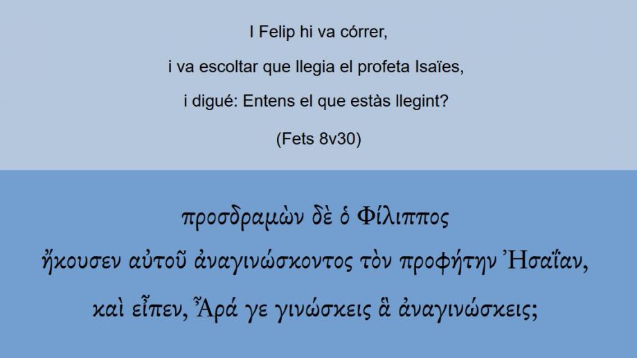 Fets 8v30 I Felip hi va córrer, i va escoltar que llegia el profeta Isaïes, i digué: Entens el que estàs llegint? προσδραμὼν δὲ ὁ Φίλιππος ἤκουσεν αὐτοῦ ἀναγινώσκοντος τὸν προφήτην Ἠσαΐαν, καὶ εἶπεν, Ἆρά γε γινώσκεις ἃ ἀναγινώσκεις;