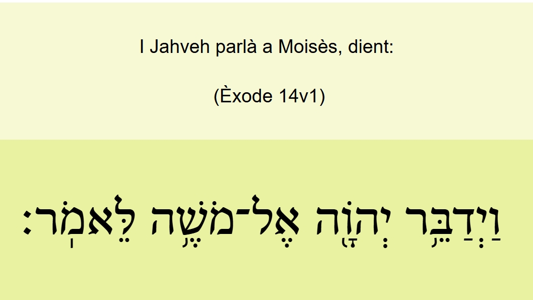 Èxode 14v1 I Jahveh parlà a Moisès, dient: וַיְדַבֵּ֥ר יְהֹוָ֖ה אֶל־מֹשֶׁ֥ה לֵּאמֹֽר׃ LXT Èxode 14v1 καὶ ἐλάλησεν κύριος πρὸς Μωυσῆν λέγων