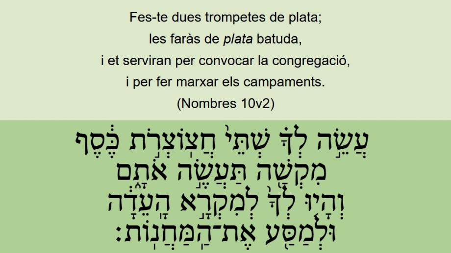 Nombres 10v2 Fes-te dues trompetes de plata; les faràs de plata batuda, i et serviran per convocar la congregació, i per fer marxar els campaments. עֲשֵׂ֣ה לְךָ֗ שְׁתֵּי֙ חֲצֽוֹצְרֹ֣ת כֶּ֔סֶף מִקְשָׁ֖ה תַּעֲשֶׂ֣ה אֹתָ֑ם וְהָי֤וּ לְךָ֙ לְמִקְרָ֣א הָֽעֵדָ֔ה וּלְמַסַּ֖ע אֶת־הַֽמַּחֲנֽוֹת׃ ποίησον σεαυτῷ δύο σάλπιγγας ἀργυρᾶς ἐλατὰς ποιήσεις αὐτάς καὶ ἔσονταί σοι ἀνακαλεῖν τὴν συναγωγὴν καὶ ἐξαίρειν τὰς παρεμβολάς
