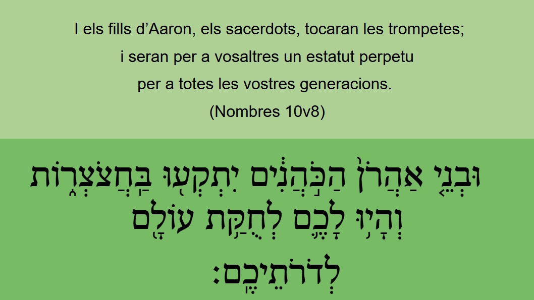 Nombres 10v8 I els fills d’Aaron, els sacerdots, tocaran les trompetes; i seran per a vosaltres un estatut perpetu per a totes les vostres generacions. וּבְנֵ֤י אַהֲרֹן֙ הַכֹּ֣הֲנִ֔ים יִתְקְע֖וּ בַּֽחֲצֹצְר֑וֹת וְהָי֥וּ לָכֶ֛ם לְחֻקַּ֥ת עוֹלָ֖ם לְדֹרֹתֵיכֶֽם׃ GNV Nombres 10:8 And the sonnes of Aaron the Priest shall blowe the trumpets, and ye shall haue them as a lawe for euer in your generations.καὶ οἱ υἱοὶ Ααρων οἱ ἱερεῖς σαλπιοῦσιν ταῖς σάλπιγξιν καὶ ἔσται ὑμῖν νόμιμον αἰώνιον εἰς τὰς γενεὰς ὑμῶνLXE And the priests the sons of Aaron shall sound with the trumpets; and it shall be a perpetual ordinance for you throughout your generations.