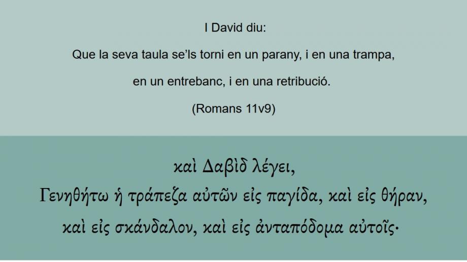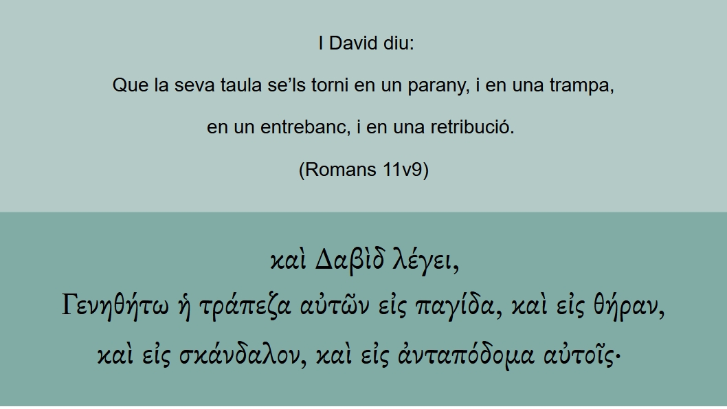 Romans 11v9 I David diu: Que la seva taula se’ls torni en un parany, i en una trampa, en un entrebanc, i en una retribució. καὶ Δαβὶδ λέγει, Γενηθήτω ἡ τράπεζα αὐτῶν εἰς παγίδα, καὶ εἰς θήραν, καὶ εἰς σκάνδαλον, καὶ εἰς ἀνταπόδομα αὐτοῖς·