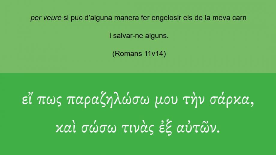 Romans 11v14 [per veure] si puc d’alguna manera fer engelosir els de la meva carn i salvar-ne alguns. εἴ πως παραζηλώσω μου τὴν σάρκα, καὶ σώσω τινὰς ἐξ αὐτῶν.