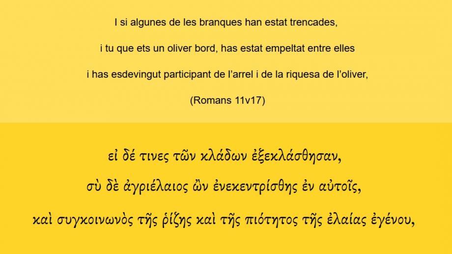 Romans 11v17 I si algunes de les branques han estat trencades, i tu que ets un oliver bord, has estat empeltat entre elles i has esdevingut participant de l’arrel i de la riquesa de l’oliver,  εἰ δέ τινες τῶν κλάδων ἐξεκλάσθησαν, σὺ δὲ ἀγριέλαιος ὢν ἐν