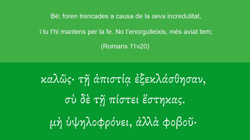 Romans 11v20 Bé; foren trencades a causa de la [seva] incredulitat, i tu t’hi mantens per la fe. No t’enorgulleixis, més aviat tem; καλῶς· τῇ ἀπιστίᾳ ἐξεκλάσθησαν, σὺ δὲ τῇ πίστει ἕστηκας. μὴ ὑψηλοφρόνει, ἀλλὰ φοβοῦ·