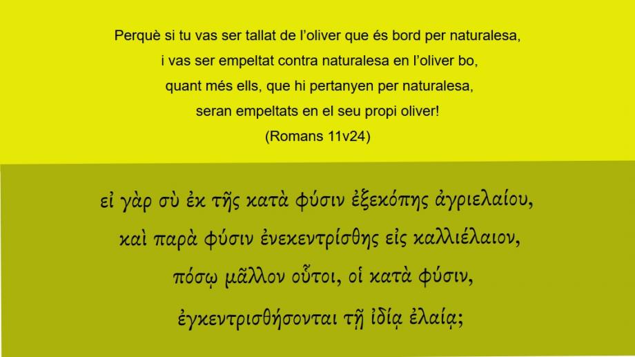 Romans 11v24 Perquè si tu vas ser tallat de l’oliver que és bord per naturalesa, i vas ser empeltat contra naturalesa en l’oliver bo, quant més ells, que hi pertanyen per naturalesa, seran empeltats en el seu propi oliver!  εἰ γὰρ σὺ ἐκ τῆς κατὰ φύσιν ἐξεκόπης ἀγριελαίου, καὶ παρὰ φύσιν ἐνεκεντρίσθης εἰς καλλιέλαιον, πόσῳ μᾶλλον οὗτοι, οἱ κατὰ φύσιν, ἐγκεντρισθήσονται τῇ ἰδίᾳ ἐλαίᾳ;