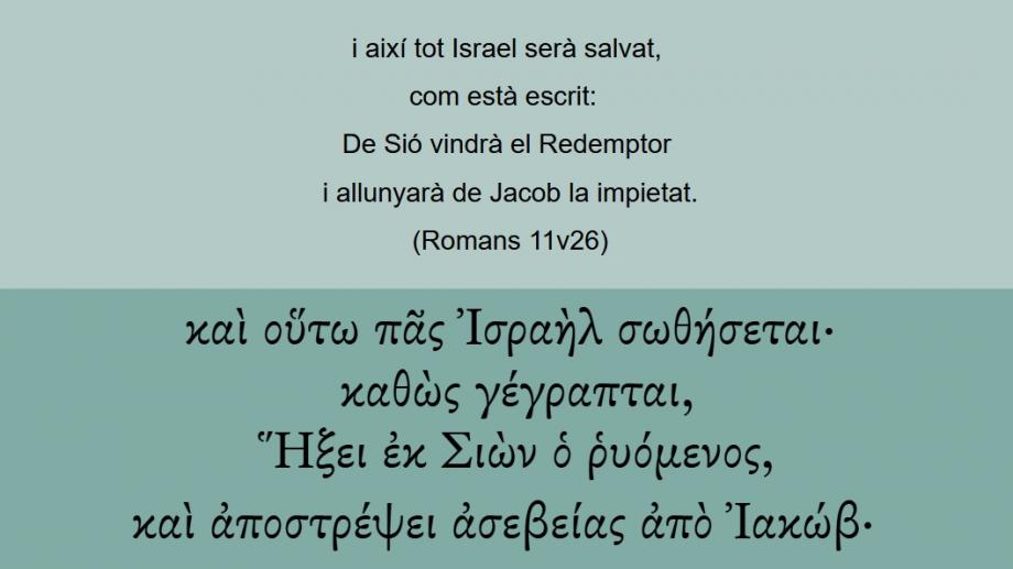 Romans 11v26 i així tot Israel serà salvat, com està escrit: De Sió vindrà el Redemptor i allunyarà de Jacob la impietat. καὶ οὕτω πᾶς Ἰσραὴλ σωθήσεται· καθὼς γέγραπται, Ἥξει ἐκ Σιὼν ὁ ῥυόμενος, καὶ ἀποστρέψει ἀσεβείας ἀπὸ Ἰακώβ·