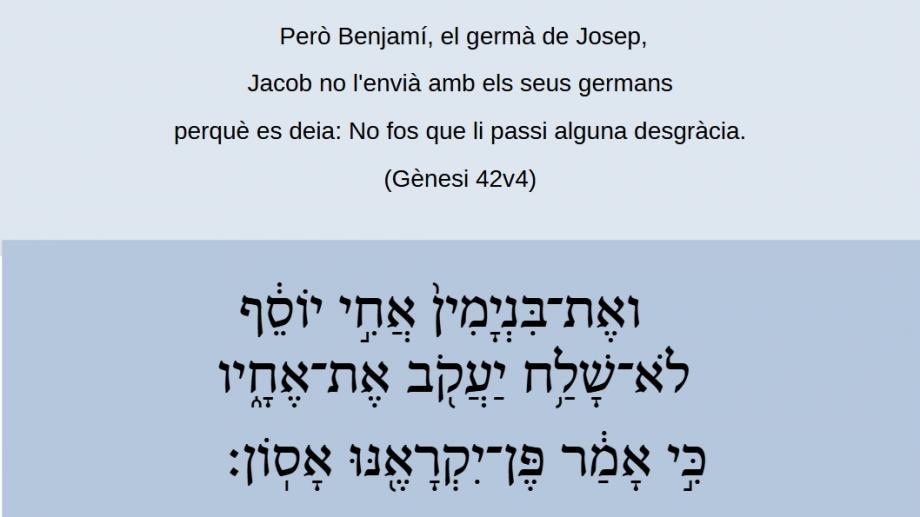 Gènesi 42v4 Però Benjamí, el germà de Josep, Jacob no l'envià amb els seus germans perquè es deia: No fos que li passi alguna desgràcia. וְאֶתֿ־בִּנְיָמִין֙ אֲחִ֣י יוֹסֵ֔ףֿ לֹֽא־שָׁלַ֥ח יַֽעֲקֹ֖בֿ אֶתֿ־אֶחָ֑יו כִּ֣י אָמַ֔ר פֶּן־יִקְרָאֶ֖נּוּ אָסֽוֹן׃ (Gn 42v4)