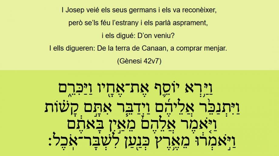 Gènesi 42v7 I Josep veié els seus germans i els va reconèixer, però se’ls féu l’estrany i els parlà asprament, i els digué: D’on veniu? I ells digueren: De la terra de Canaan, a comprar menjar. וַיַּ֥רְא יוֹסֵ֛ףֿ אֶתֿ־אֶחָ֖יו וַיַּכִּרֵ֑ם וַיִּתְֿנַכֵּ֨ר אֲלֵיהֶ֜ם וַיְדַֿבֵּ֧ר אִתָּ֣ם קָשׁ֗וֹתֿ וַיֹּ֤אֿמֶר אֲלֵהֶם֙ מֵאַ֣יִן בָּאֿתֶ֔ם וַיֹּ֣אֿמְר֔וּ מֵאֶ֥רֶץ כְּנַ֖עַן לִשְׁבָּר־אֹֽכֶֿל׃ (Gn 42v7)