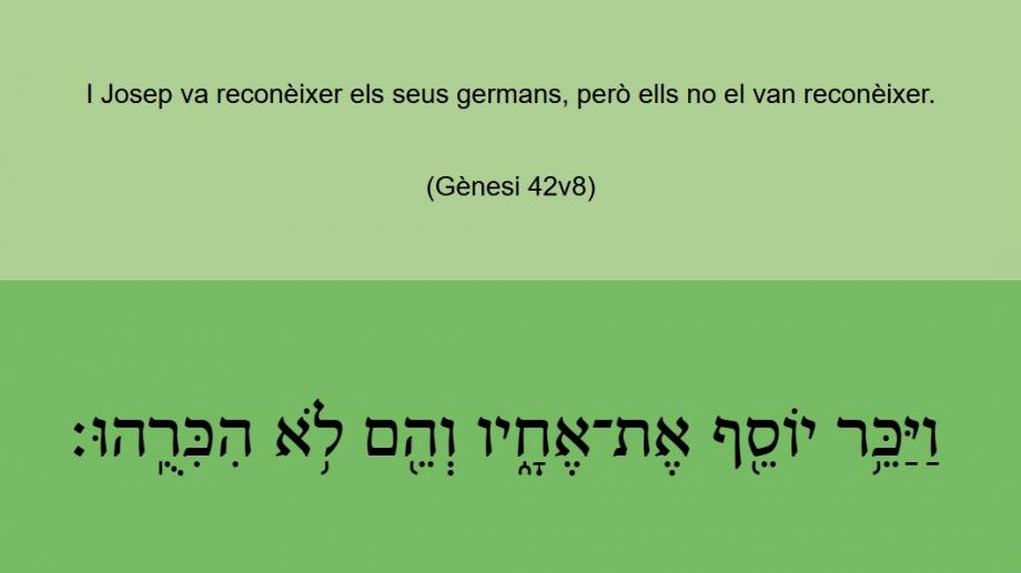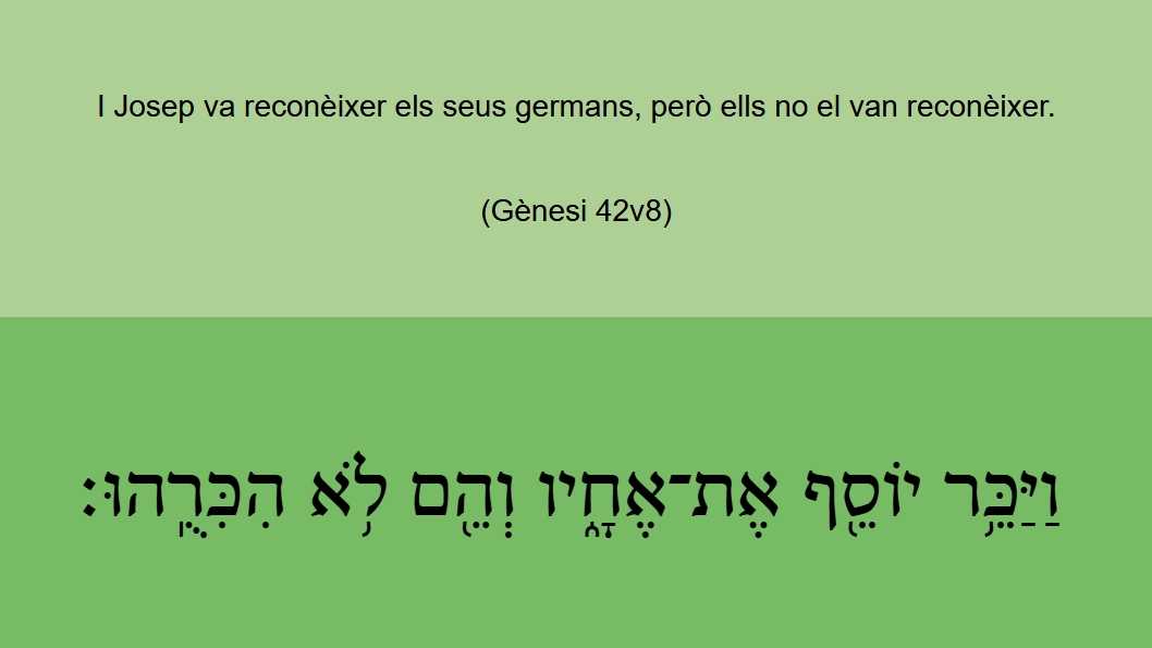 Data: 2025-12-08, dillunsComentari: Gènesi 42v8 I Josep va reconèixer els seus germans, però ells no el van reconèixer. וַיַּכֵּ֥ר יוֹסֵ֖ףֿ אֶתֿ־אֶחָ֑יו וְהֵ֖ם לֹ֥א הִכִּרֻֽהוּ׃ (Gn 42v8)