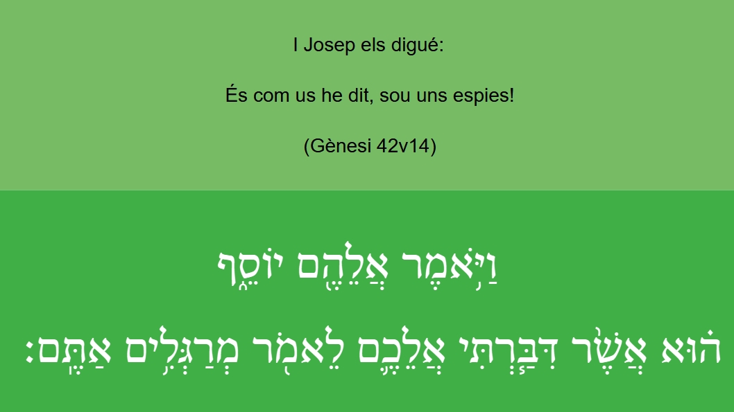 Gènesi 42v14 I Josep els digué: És com us he dit, sou uns espies! וַיֹּ֥אֿמֶר אֲלֵהֶ֖ם יוֹסֵ֑ףֿ ה֗וּא אֲשֶׁ֨ר דִּבַּ֧רְתִּי אֲלֵכֶֿ֛ם לֵאֿמֹ֖ר מְרַגְּלִ֥ים אַתֶּֽם׃ (Gn 42v14)
