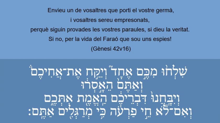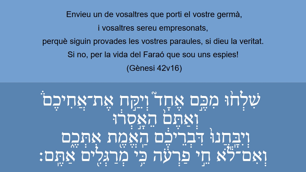 Gènesi 42v16 Envieu un de vosaltres que porti el vostre germà, i vosaltres sereu empresonats, perquè siguin provades les vostres paraules, si dieu la veritat. Si no, per la vida del Faraó que sou uns espies! שִׁלְח֨וּ מִכֶּ֣ם אֶחָד֘ וְיִקַּ֣ח אֶתֿ־אֲחִיכֶֿם֒ וְאַתֶּם֙ הֵאָ֣סְר֔וּ וְיִֽבָּֽחֲנוּ֙ דִּבְֿרֵיכֶ֔ם הַֽאֱמֶ֖תֿ אִתְּכֶֿ֑ם וְאִם־ל֕אֺ חֵ֣י פַֿרְעֹ֔הֿ כִּ֥י מְרַגְּלִ֖ים אַתֶּֽם׃ (Gn 42v16)