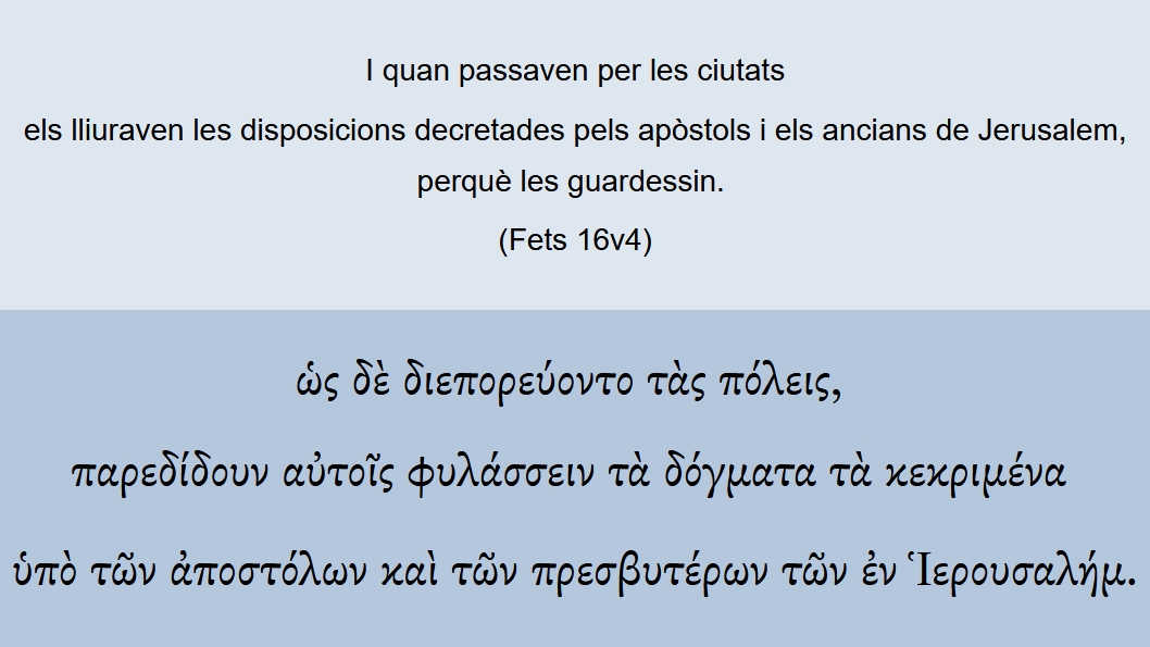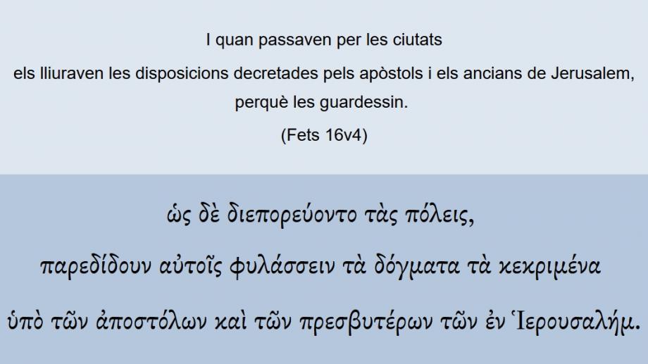Fets 16v4 I quan passaven per les ciutats els lliuraven les disposicions decretades pels apòstols i els ancians de Jerusalem, perquè les guardessin. ὡς δὲ διεπορεύοντο τὰς πόλεις, παρεδίδουν αὐτοῖς φυλάσσειν τὰ δόγματα τὰ κεκριμένα ὑπὸ τῶν ἀποστόλων καὶ τῶν πρεσβυτέρων τῶν ἐν Ἱερουσαλήμ.