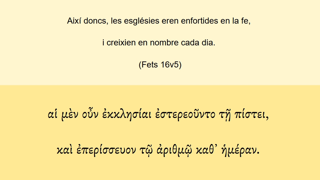 Fets 16v5 Així doncs, les esglésies eren enfortides en la fe, i creixien en nombre cada dia. αἱ μὲν οὖν ἐκκλησίαι ἐστερεοῦντο τῇ πίστει, καὶ ἐπερίσσευον τῷ ἀριθμῷ καθ᾽ ἡμέραν.