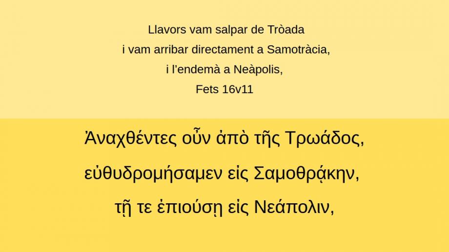 Fets 16v11 Llavors vam salpar de Tròada i vam arribar directament a Samotràcia, i l’endemà a Neàpolis, Ἀναχθέντες οὖν ἀπὸ τῆς Τρωάδος, εὐθυδρομήσαμεν εἰς Σαμοθρᾴκην, τῇ τε ἐπιούσῃ εἰς Νεάπολιν, (Ft 16v11)