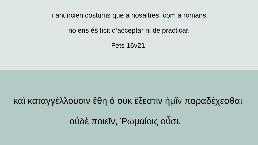 Fets 16v21 i anuncien costums que a nosaltres, com a romans, no ens és lícit d’acceptar ni de practicar.καὶ καταγγέλλουσιν ἔθη ἃ οὐκ ἔξεστιν ἡμῖν παραδέχεσθαι οὐδὲ ποιεῖν, Ῥωμαίοις οὖσι. (Ft 16v21)