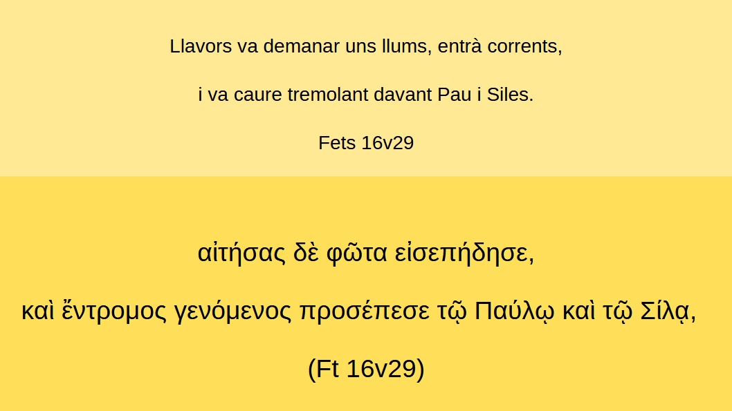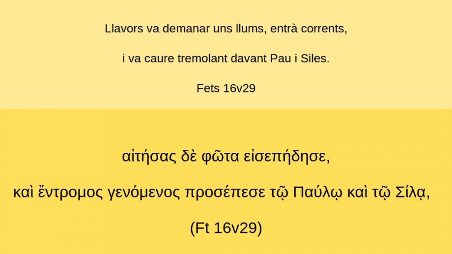 Data: 2026-01-29, dijousComentari: Fets 16v29 Llavors va demanar uns llums, entrà corrents, i va caure tremolant davant Pau i Siles. αἰτήσας δὲ φῶτα εἰσεπήδησε, καὶ ἔντρομος γενόμενος προσέπεσε τῷ Παύλῳ καὶ τῷ Σίλᾳ, (Ft 16v29)