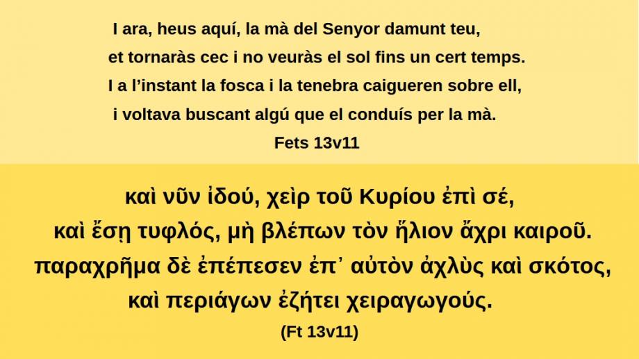 Fets 13v11 I ara, heus aquí, la mà del Senyor damunt teu, et tornaràs cec i no veuràs el sol fins un cert temps. I a l’instant la fosca i la tenebra caigueren sobre ell, i voltava buscant algú que el conduís per la mà.καὶ νῦν ἰδού, χεὶρ τοῦ Κυρίου ἐπὶ σέ, καὶ ἔσῃ τυφλός, μὴ βλέπων τὸν ἥλιον ἄχρι καιροῦ. παραχρῆμα δὲ ἐπέπεσεν ἐπ᾽ αὐτὸν ἀχλὺς καὶ σκότος, καὶ περιάγων ἐζήτει χειραγωγούς. (Ft 13v11)
