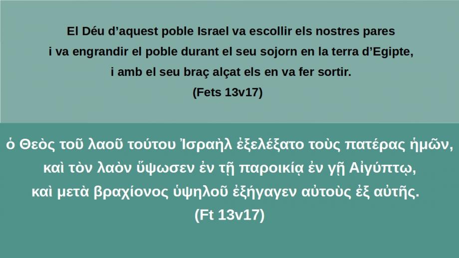 Fets 13v17 El Déu d’aquest poble Israel va escollir els nostres pares i va engrandir el poble durant el seu sojorn en la terra d’Egipte, i amb el seu braç alçat els en va fer sortir.ὁ Θεὸς τοῦ λαοῦ τούτου Ἰσραὴλ ἐξελέξατο τοὺς πατέρας ἡμῶν, καὶ τὸν λαὸν ὕψωσεν ἐν τῇ παροικίᾳ ἐν γῇ Αἰγύπτῳ, καὶ μετὰ βραχίονος ὑψηλοῦ ἐξήγαγεν αὐτοὺς ἐξ αὐτῆς. (Ft 13v17)