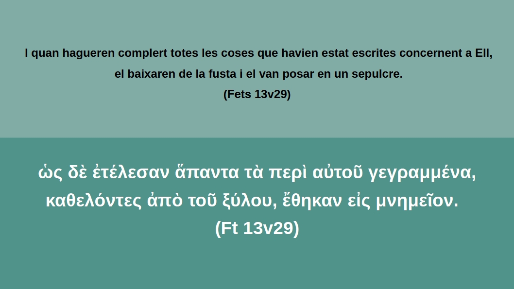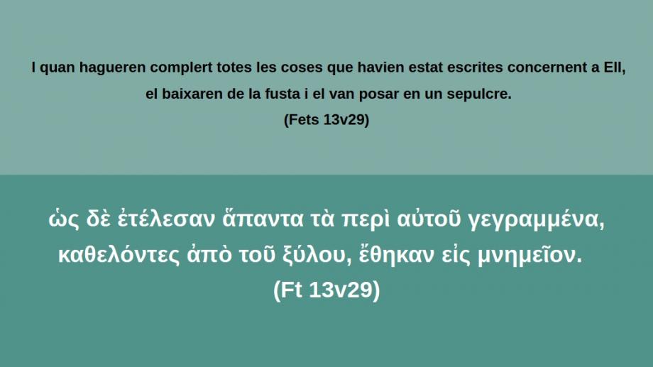 Fets 13v29 I quan hagueren complert totes les coses que havien estat escrites concernent a Ell, el baixaren de la fusta i el van posar en un sepulcre.ὡς δὲ ἐτέλεσαν ἅπαντα τὰ περὶ αὐτοῦ γεγραμμένα, καθελόντες ἀπὸ τοῦ ξύλου, ἔθηκαν εἰς μνημεῖον.   (Ft 13v29)