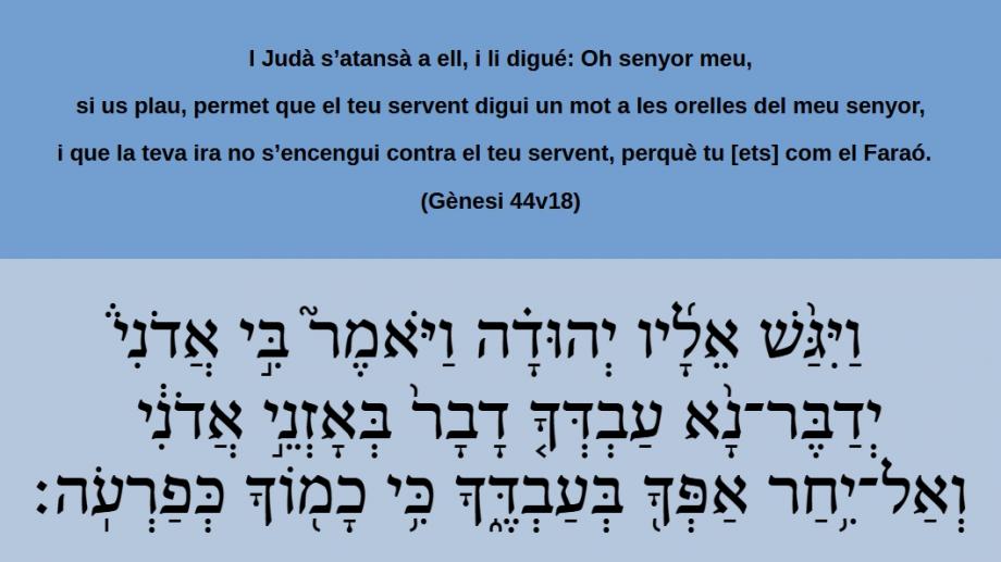 Gènesi 44v18 I Judà s’atansà a ell, i li digué: Oh senyor meu, si us plau, permet que el teu servent digui un mot a les orelles del meu senyor, i que la teva ira no s’encengui contra el teu servent, perquè tu [ets] com el Faraó.   § וַיִּגַּ֨שׁ אֵלָ֜יו יְהוּדָ֗הֿ וַיֹּאֿמֶר֘ בִּ֣י אֲדֹֿנִי֒ יְדַֿבֶּר־נָ֨א עַבְֿדְּךָֿ֤ דָֿבָֿר֙ בְּאָזְנֵ֣י אֲדֹֿנִ֔י וְאַל־יִ֥חַר אַפְּךָֿ֖ בְּעַבְֿדֶּ֑ךָֿ כִּ֥י כָֿמ֖וֹךָֿ כְּפַֿרְעֹֽהֿ׃   (Gn 44v18)   §
