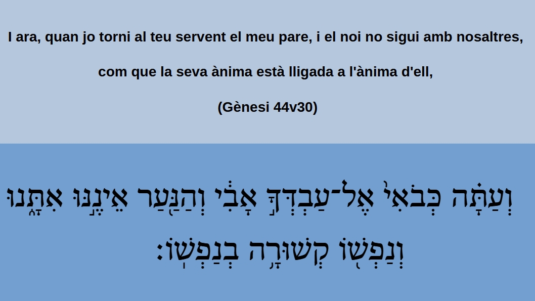Gènesi 44v30 I ara, quan jo torni al teu servent el meu pare, i el noi no sigui amb nosaltres, com que la seva ànima està lligada a l'ànima d'ell, וְעַתָּ֗הֿ כְּבֹֿאִי֙ אֶל־עַבְֿדְּךָֿ֣ אָבִ֔י וְהַנַּ֖עַר אֵינֶנּ֣וּ אִתָּ֑נוּ וְנַפְֿשׁ֖וֹ קְשׁוּרָ֥הֿ בְֿנַפְֿשֽׁוֹ׃ (G