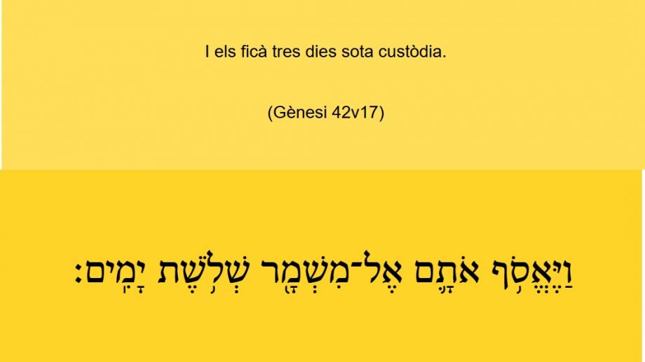 Gènesi 42v17 I els ficà tres dies sota custòdia. (Gn 42v17) וַיֶּֽאֱסֹ֥ףֿ אֹתָֿ֛ם אֶל־מִשְׁמָ֖ר שְׁלֹ֥שֶׁתֿ יָמִֽים׃ (Gn 42v17)