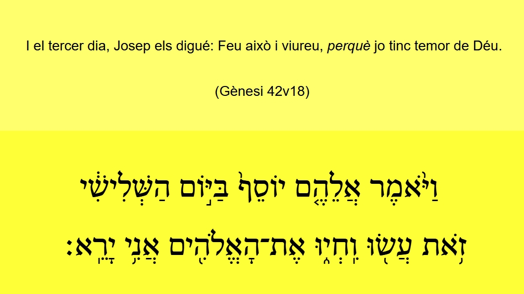 Gènesi 42v18 I el tercer dia, Josep els digué: Feu això i viureu, [perquè] jo tinc temor de Déu. וַיֹּ֨אֿמֶר אֲלֵהֶ֤ם יוֹסֵף֙ בַּיּ֣וֹם הַשְּׁלִישִׁ֔י זֹ֥אֿתֿ עֲשׂ֖וּ וִֽחְי֑וּ אֶתֿ־הָֽאֱלֹהִ֖ים אֲנִ֥י יָרֵֽא׃ (Gn 42v18)