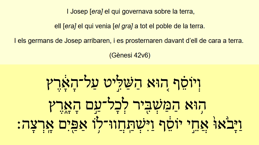 Gènesi 42v6 I Josep [era] el qui governava sobre la terra, ell [era] el qui venia [el gra] a tot el poble de la terra. I els germans de Josep arribaren, i es prosternaren davant d’ell de cara a terra. וְיוֹסֵ֗ףֿ ה֚וּא הַשַּׁלִּ֣יט עַל־הָאָ֔רֶץ ה֥וּא הַמַּשְׁבִּ֖יר לְכָֿל־עַ֣ם הָאָ֑רֶץ וַיָּבֹ֙אוּ֙ אֲחֵ֣י יוֹסֵ֔ףֿ וַיִּשְׁתַּֽחֲווּ־ל֥וֹ אַפַּ֖יִם אָֽרְצָהֿ׃ (Gn 42v6)