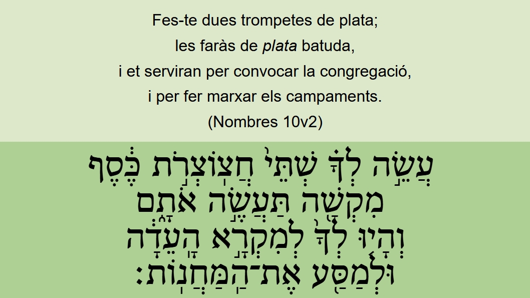 Nombres 10v2 Fes-te dues trompetes de plata; les faràs de plata batuda, i et serviran per convocar la congregació, i per fer marxar els campaments. עֲשֵׂ֣ה לְךָ֗ שְׁתֵּי֙ חֲצֽוֹצְרֹ֣ת כֶּ֔סֶף מִקְשָׁ֖ה תַּעֲשֶׂ֣ה אֹתָ֑ם וְהָי֤וּ לְךָ֙ לְמִקְרָ֣א הָֽעֵדָ֔ה וּלְמַסַּ֖ע אֶת־הַֽמַּחֲנֽוֹת׃ ποίησον σεαυτῷ δύο σάλπιγγας ἀργυρᾶς ἐλατὰς ποιήσεις αὐτάς καὶ ἔσονταί σοι ἀνακαλεῖν τὴν συναγωγὴν καὶ ἐξαίρειν τὰς παρεμβολάς