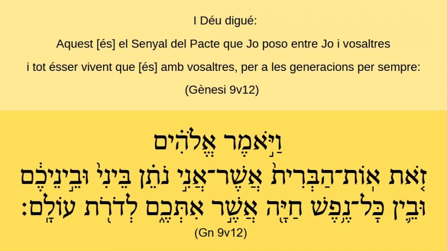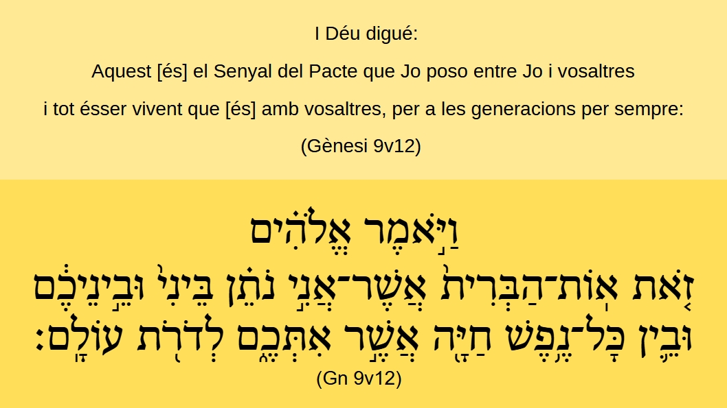 Gènesi 9v12 I Déu digué: Aquest [és] el Senyal del Pacte que Jo poso entre Jo i vosaltres i tot ésser vivent que [és] amb vosaltres, per a les generacions per sempre:וַיֹּ֣אֿמֶר אֱלֹהִ֗ים זֹ֤אֿתֿ אֽוֹתֿ־הַבְּרִית֙ אֲשֶׁר־אֲנִ֣י נֹתֵ֗ן בֵּינִי֙ וּבֵֿ֣ינֵיכֶ֔ם וּבֵֿ֛ין כָּל־נֶ֥פֶֿשׁ חַיָּ֖הֿ אֲשֶׁ֣ר אִתְּכֶֿ֑ם לְדֹֿרֹ֖תֿ עוֹלָֽם׃ (Gn 9v12)